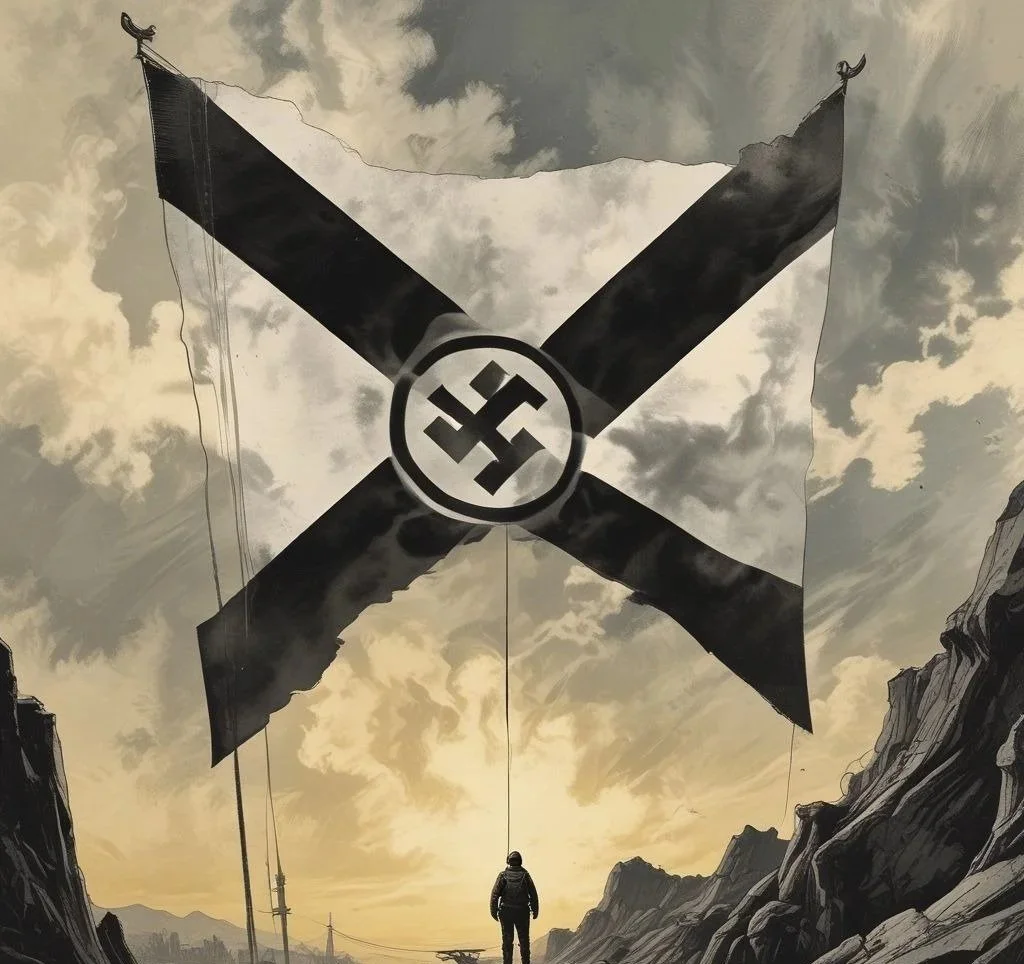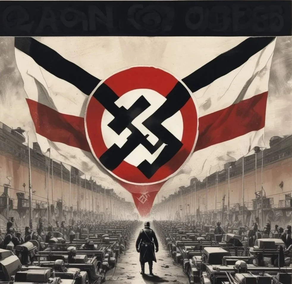 There are no visible SS uniforms, no overt swastikas, just the silver eagle, the cold efficiency of surveillance drones, and the quiet erasure of dissent.