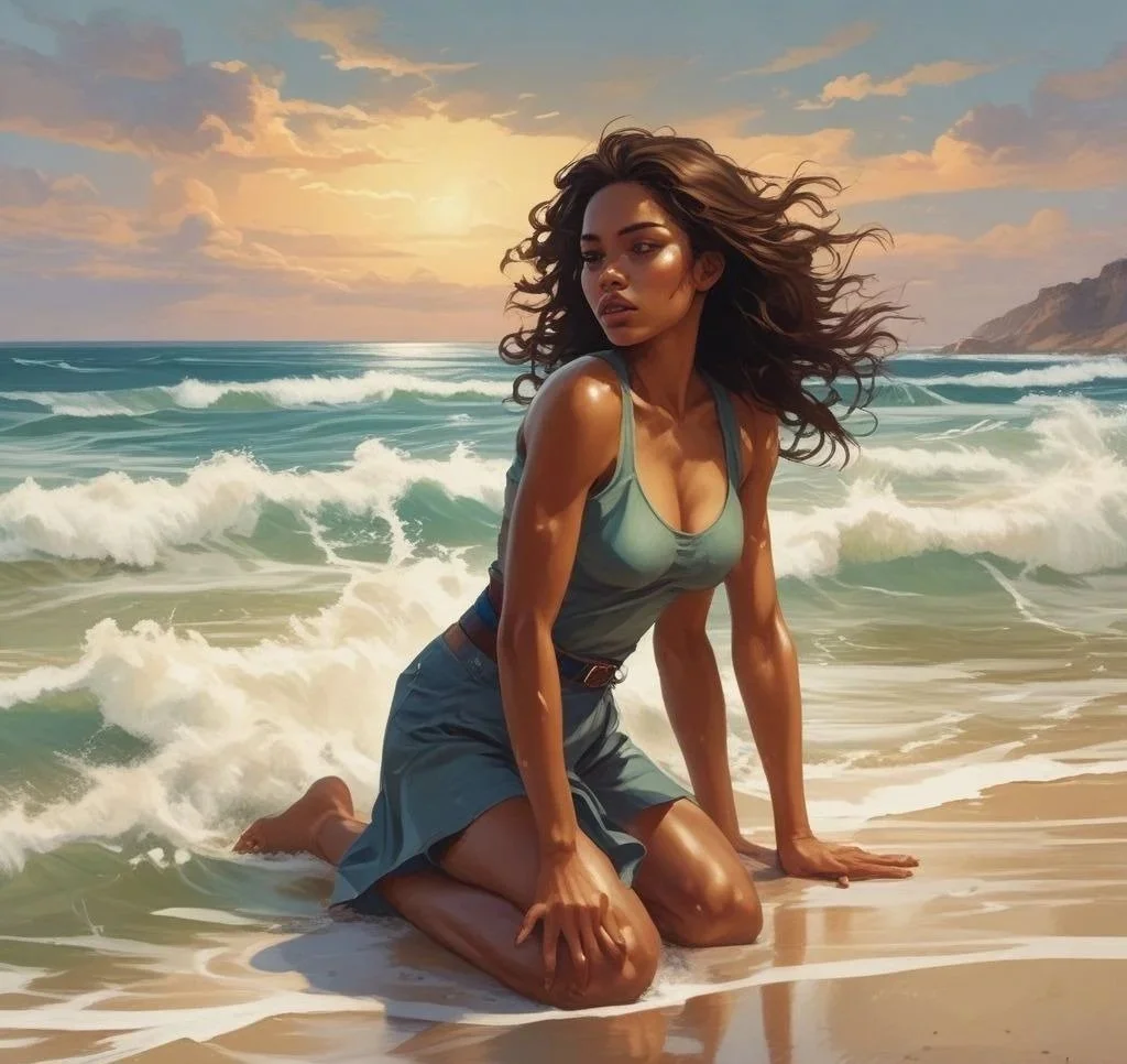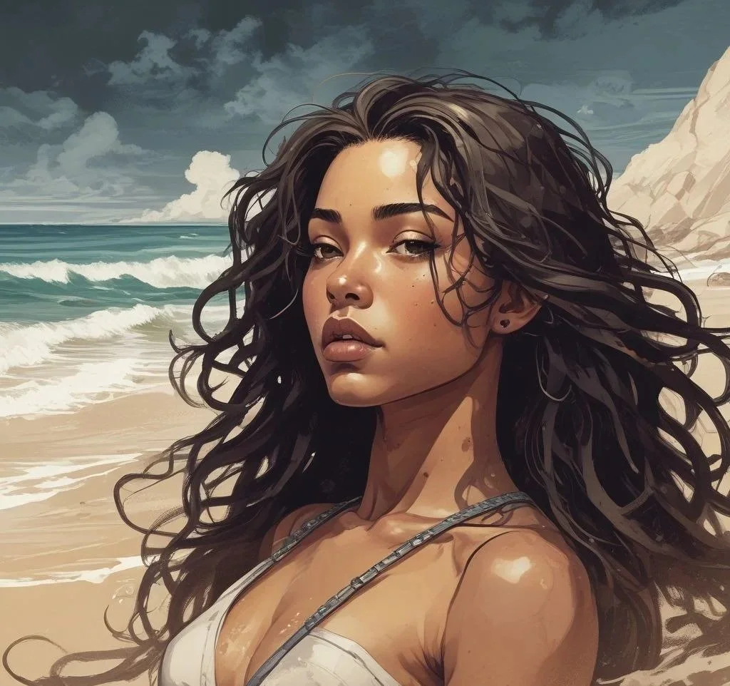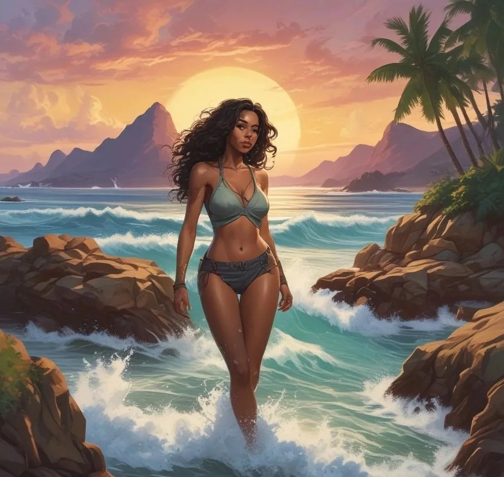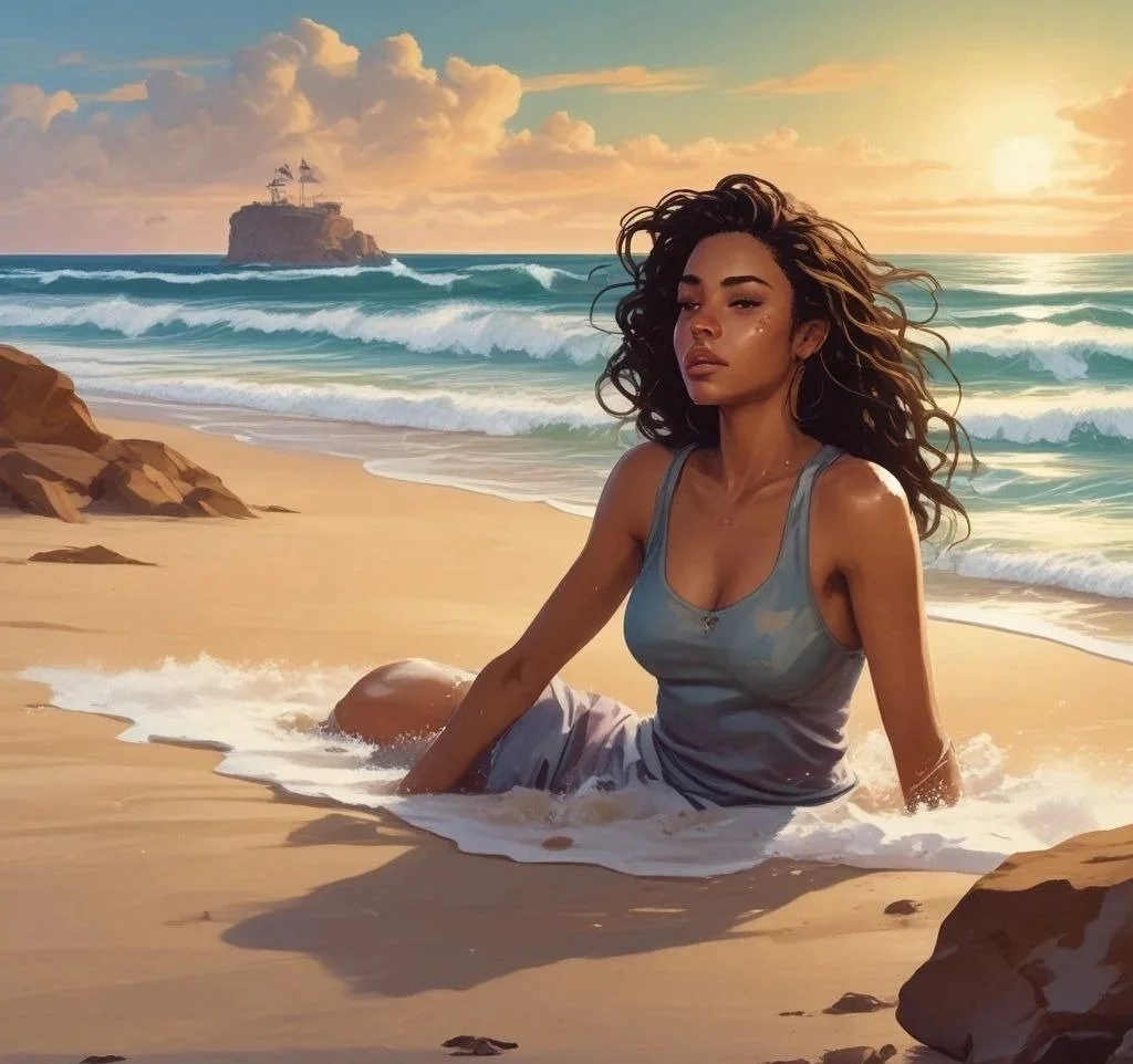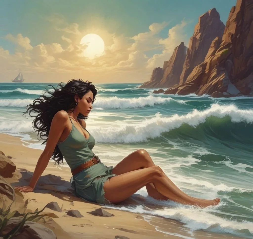 With a sigh of relief, she collapsed onto the beach, her back pressed against a weathered boulder. The warm grains of sand seeped between her toes as she closed her eyes, relinquishing to the soothing lullaby of the waves. A soft, salty breeze caressed her skin, carrying the sweet scent of frangipani and hibiscus.